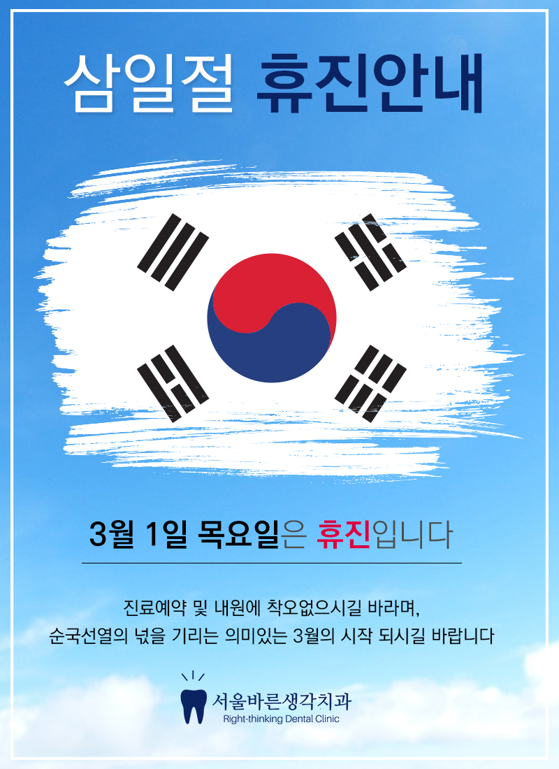 인쇄하기/글자확대.축소 기본 크게 더크게 인쇄 스크랩 목록보기 2018 삼일절 진료 휴진안내 페이지 정보 작성자.바른생각치과 작성일.2018-02-26 19:44:17 조회.4,700 댓글.0 본문 안녕하세요, 서울바른생각치과 입니다. 2018년 3월 1일 (목) 삼일절 당일은휴진합니다. 진료 예약 및 방문에 차질 없으시도록참고 부탁드리겠습니다.감사합니다 ! 인쇄하기/글자확대.축소 기본 크게 더크게 인쇄 스크랩 목록보기 이전글 ▲5월 5일 (토) 휴진, 8일 (월) 정상진료 입니다. 다음글 ▼2018 설 연휴 휴진 일정 안내드립니다. 댓글목록 등록된 댓글이 없습니다. 이전글 다음글 목록보기