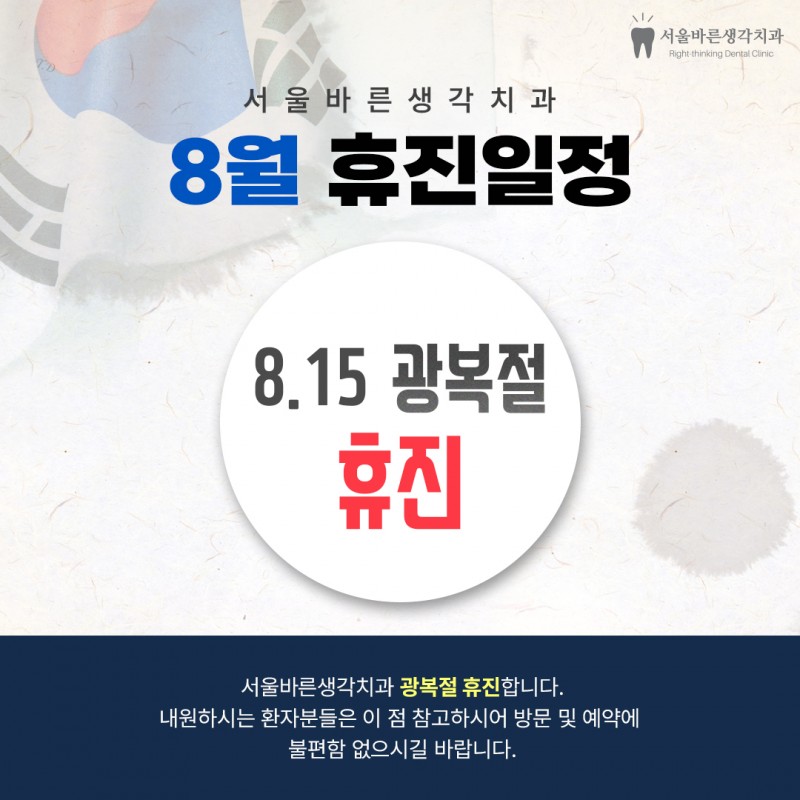 인쇄하기/글자확대.축소 기본 크게 더크게 인쇄 스크랩 목록보기 서울바른생각치과 22년 8월 진료일정 페이지 정보 작성자.바른생각치과 작성일.2022-07-28 12:07:39 조회.3,256 댓글.0 본문 안녕하세요. 서울바른생각치과입니다.본원 8월 15일 (광복절) 휴진하오니,내원하시는 환자분들은 이 점 참고하시어방문해주시길 바랍니다. 전화문의: 031-752-7525 인쇄하기/글자확대.축소 기본 크게 더크게 인쇄 스크랩 목록보기 이전글 ▲서울바른생각치과 22년 9월 진료일정 다음글 ▼▶ [이벤트] 개원 6주년 치아교정, 일반진료 이벤트 진행 ! (~08/31) ◀ 댓글목록 등록된 댓글이 없습니다. 이전글 다음글 목록보기